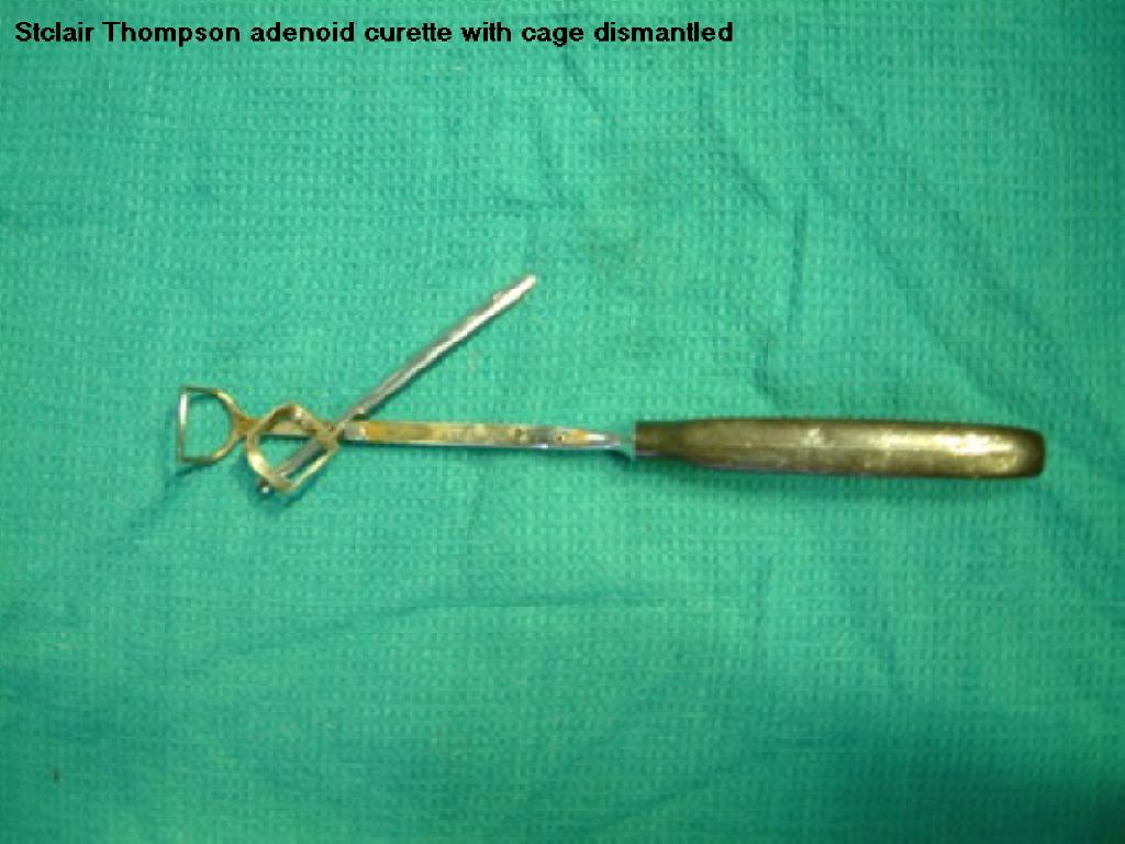 Adenoid is removed during tonsillectomy using St Claire Thompson Adenoid curette. This instrument is held in the dominant hand during surgery like a dagger. It comes in two versions 1. with cage and 2. without cage. In fact the adenoid curette with cage can be dismantled and cage removed and can be used like a uncaged curette. The basic advantage of having this cage is the adenoid tissue is held within the cage while it is being scooped out thereby minimising the risk of aspiration of adenoid tissue into the airway. It can also be removed using a micro debrider intranasally under endoscopic control.