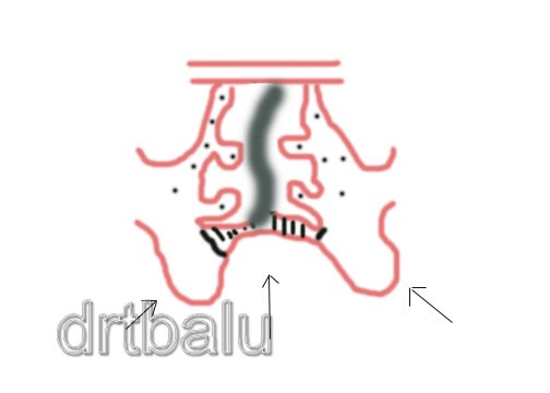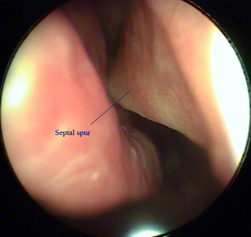 Spurs - These are sharp angulations seen in the nasal septum occuring at the junction of the vomer below, with the septal cartilage and / or ethmoid bone above. This type of deformity is the result of vertical compression forces. Fractures that occur through nasal septum during injury to the nose may also produce sharp angulations . These fractures heal by fibrosis that extend to the adjacent mucoperichondrium. This increases the difficulty of flap elevation in this area.