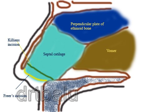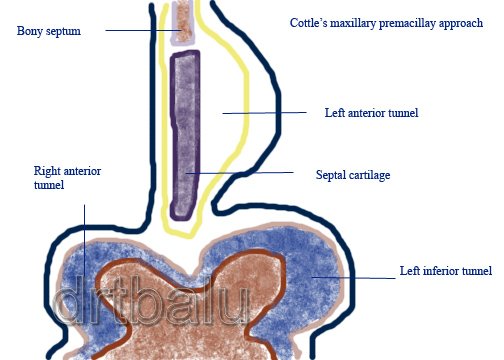 This is a more conservative procedure. The anesthesia is the same as described for SMR operation. The incision is always sited on the concave side of the septum. Freer's hemitransfixation incision is preferred. This is made at the lower border of the septal cartilage. A unilateral Freer's incision is sufficient for septoplasty. Three tunnels are created as shown in the figure.