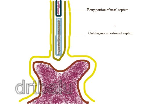 Figure showing unusual growth patterns between nasal septum and palate causing buckling of nasal septum