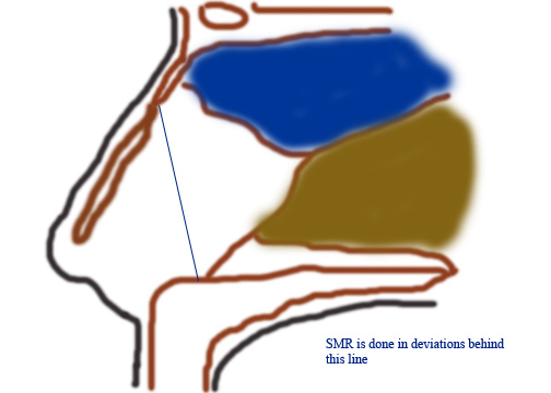 Submucosal resection of nasal septum is ideally performed under local anaesthesia. 4% xylocaine is used as topical anesthetic agent by nasal packing. 2% xylocaine is used as infiltrative anesthetic agent. It is mixed with 1 in 1 lakh adrenaline. Infiltration is done at the mucocutaneous junction on both sides just behind the columella. The floor of the nasal cavity is also infiltrated on the concave side. Killian's incision is preferred for SMR operations. Killian's incision is the commonly used incision. It is an oblique incision given about 5mm above the caudal border of the septal cartilage.