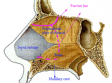 The precise nature of the deformity depends on the direction of the blow sustained. A frontal impact may cause comminated fracture of nasal bones causing gross flattening and widening of the dorsum of the nose. A lateral blow of similar magnitude is likely to produce a high deviation of the nasal skeleton. The perpendicular plate of ethmoid is invariably involved in these fractures, and is characteristically C shaped (Jarjaway fracture of nasal septum).