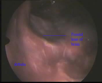 Using a 4mm 0° nasal endoscope the surgery was performed. The complete surgery was performed under general anesthesia. On deroofing the agger nasi cell the contents of the mucocele started to extrude. The frontal sinus ostium was widened. When the scope was introduced through the widened frontal ostium the posterior table of the frontal sinus was found to be eroded. The frontal lobe of the brain was clearly visible. The brain can be identified by its characteristic pulsations coinciding with the patient's respiration.