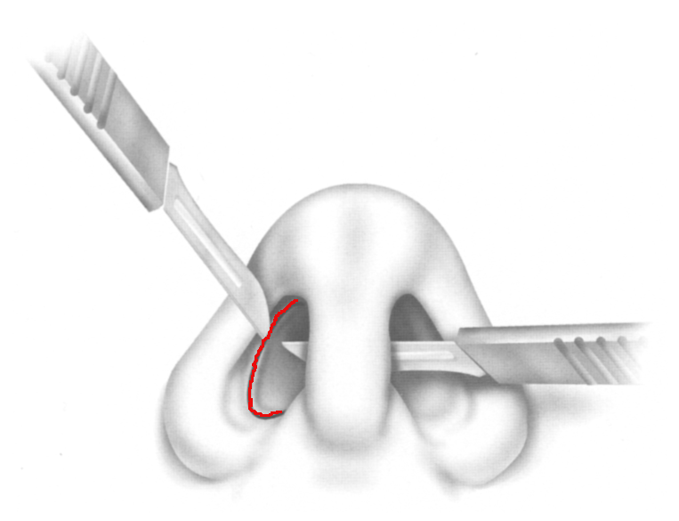 The procedure is started with complete transfixion incision, which is connected to bilateral intercartilagenous incisions. Elevation of soft tissue from the nasal dorsum is performed through the intercartilagenous space. The soft tissue elevation over dorsum of nose is continued over the anterior wall of maxilla on both sides. Elevation of soft tissue should also continue over the glabella and frontal bone. Supero laterally the elevation should extend up to the medial canthal region. The intercartilagenous incision is extended laterally and caudally across the floor of the vestibule to be connected with the transfixation incision. This results in a full circumvestibular incision on both sides.