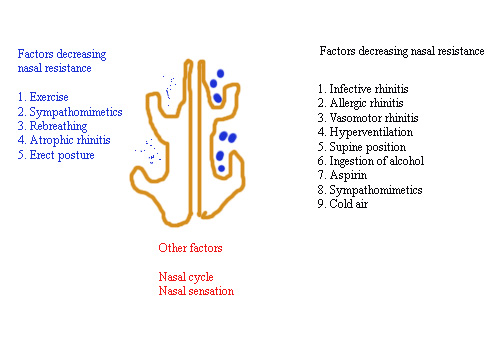 In normal healthy subjects the nasal airway resistance is determined by the degree of engorgement of venous erectile tissue, as well as the accessory muscles of respiration which keep the nasal airway patent. The venous erectile tissue of nasal mucosa has dense adrenergic innervation which when stimulated cause intense vasoconstriction thereby decreasing the nasal airway resistance. Normally there is a continuous sympathetic vasoconstrictor tone to the nasal erectile tissue keeping the nasal airway resistance under check. Reduction in this sympathetic tone increases the nasal airway resistance. The parasympathetic tone in the nose controls nasal secretion, but has little role in nasal resistance.
