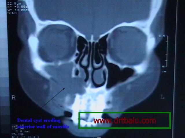 Management: If the cyst is small, then it may resolve with endodontic therapy of the involved tooth. If the cyst is large then it will have to excised / marsupialised through Caldwell Luc approach. With the advent of nasal ensoscopy, the lesion could be accessed using a nasal endscope. The excised specimen should be sent for histopathological examination because squamous cell carcinoma could be lurking within the cystic lesion.