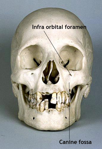 Anterior: Wall corresponds to the facial surface of the superior maxilla. Over the canine fossa it is only 2mm in thickness. It is though this canine fossa area that maxillay antrum is entered during Caldwell Luc surgery.