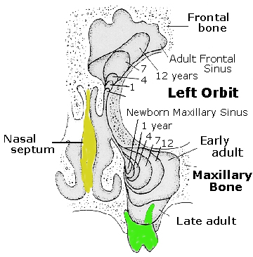 The maxillay sinus has biphasic growth. The first phase of growth occur during the first 3 years of life while the second phase occur between 7 - 18 years.