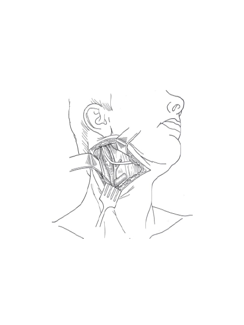 Transcervical approach: Transcervical approach starts with a transverse incision at the level of the hyoid bone. The submandibular gland is often removed or retracted anteriorly. An incision through the fascia deep to the submandibular space allowed for entry into the parapharyngeal space and blunt dissection of the tumor. Many modifications have reported. Some surgeons divide the digastric, stylohyoid, and styloglossus muscles from the hyoid bone to improve exposure. The styloid process and the stylomandibular ligament can also be divided to elevate the mandible anteriorly to improve access. This approach frequently involves blind finger dissection in the parapharyngeal space and does not provide enough exposure for larger benign lesions extending cranially or those with a more aggressive growth pattern. This can be combine with mandibulotomy for better exposure. The key to the site of mandibulotomy is to avoid injury to the inferior alveolar nerve while providing access to parapharyngeal space.
