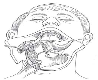 Cervical transpharyngeal approach: is used to excise large and highly vascular tumors. In this approach mandibulotomy is performed anteriorly and incision is made along the floor of the mouth up to the anterior pillar. The advantage of anterior mandibulotomy is the ease with which mandible can be swung laterally. It is thus known as mandibular swing approach.