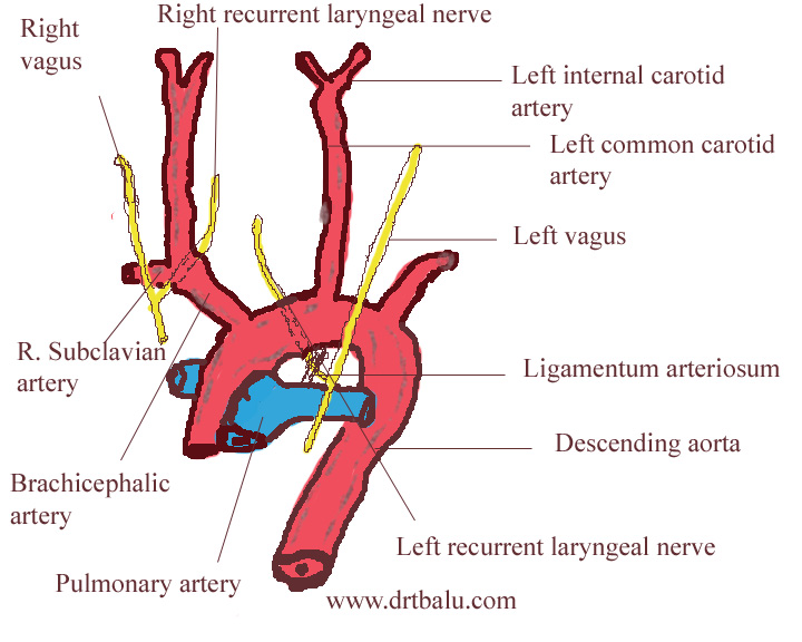 The course taken by the vagus nerve differs between the right and the left sides. The left vagus nerve follows the carotid artery into the mediastinum crossing anterior to the aortic arch. The recurrent laryngeal nerve arising from the vagal nerve just below the aortic arch loops medially under the aorta and ascends within the tracheoesophageal groove. The anterior bronchoesophageal artery supplies the left vagus nerve. The right vagus nerve descends with the common carotid artery. At the level of division of the innominate artery, the right recurrent laryngeal nerve loops around the subclavian artery and ascends along the superior lobe of the pleura. It then approaches the trachoesophageal groove behind the common carotid artery. The approximate length of the left recurrent laryangeal nerve is 12 cms, where as the right nerve measures about 6 cms only. Considering the extra length and the distance the left recurrent laryngeal nerve has to travel, it is the common nerve affected by diseases / disorders / trauma etc. The right recurrent laryngeal nerve does not get into the tracheoesophageal groove until it approaches the cricothyroid joint. In some patients the right recurrent laryngeal nerve is given off from the vagus nerve at the level of thyroid gland, this condition is always associated with an anomalous retroesophageal location of the right subclavian artery. This is also known as a non recurrent variation of the right recurrent laryngeal nerve. This condition palces the nerve at risk during thyroid surgery.