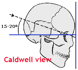 To get a caldwell view the patient is made to sit in front of the film with the radiographic base line tilted to an angle of 15 - 20 degrees upwards. The incident beam is horizontal and is centered 1/2 inch below the external occipital protruberance. This view is also known as the frontal sinus view.