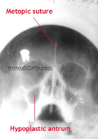 In x ray para nasal sinuses waters view the normal frontal sinus margins show scalloping. Loss of this scalloping is a classic feature of frontal mucocele. If frontal sinus is congenitally absent (agenisis) then a suture line known as the metopic suture is visible in the fore head area. Sometimes a pair of large anterior ethmoidal air cells may take up the place of frontal sinuses. Here too the metopic suture line is visible. This suture divides the two halfs of frontal bone of the skull in infants and children. This suture line usually disappears at the age of 6 when it fuses. If this suture is not present at birth it will cause a keel shaped deformity of the skull (trigonocephaly).