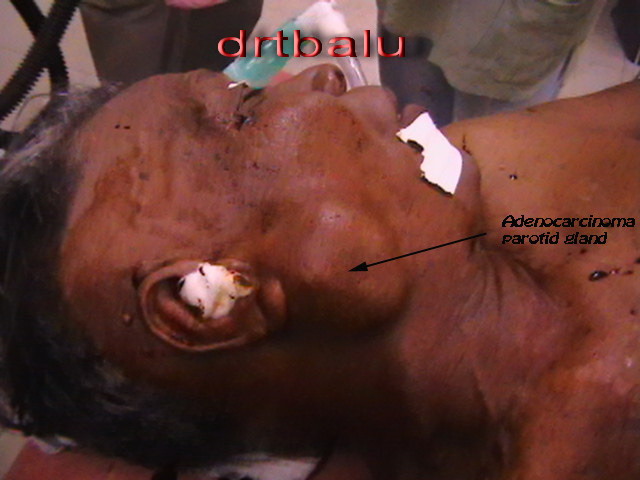 Adenocarcinoma / papillary cystadenocarcinoma / mucinous adenocarcinoma: These are the different histological types of a single entity (adenocarcinoma). In fact they can also be considered as variants of adenocarcinoma. Mucinous and papillary cystadenocarcinoma are low grade malignancies. The non mucin secreting variety is the most virulent in this group. Most adenocarcinomas arise from the parotid gland. They constitute only a very small proportion of parotid tumors. They are common in the 6th and 7th decades of life. Females are commonly affected. Surgery appears to be the most favoured treatment modality.