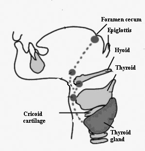 Embryology: The thyroid gland originates from the foramen cecum present in the floor of the pharyngeal gut on the 17th day of gestation. The gland then descends in front of the pharynx as a bilobed diverticulum which is initially patent. It reaches its final position in the neck by the 7th week of gestation. The duct usually disappears by the 10th week of gestation. Persistence of any portion of this duct could give rise to thyroglossal cyst.