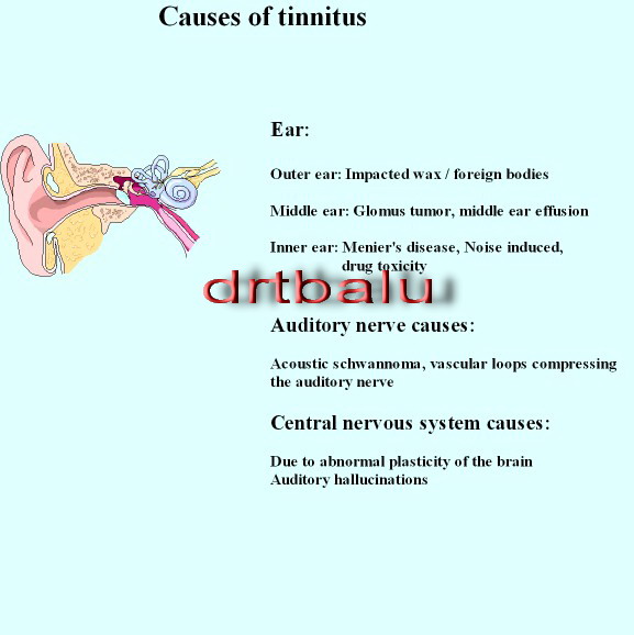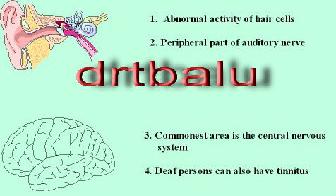 Tinnitus generated from the ear: Commonly Meniere's disease cause roaring tinnitus. This disorder includes a triad of symptoms which include fluctuating hearing loss, roaring tinnitus and vertigo. Some forms of tinnitus gets alleviated by sectioning of auditory nerve, thus attributing auditory nerves as a possible site of generation. Electrical current when passed through cochlea can reduce tinnitus in some patients. This beneficial effect occurs in patients in whom there is deprivation of nerual activity in the auditory nerve. Cochlear implants can alleviate tinnitus in some patients, this goes to proove the hypothesis as correct. Even the presence of wax in the external canal can cause tinnitus by blocking out the ambient noise and making the patient aware of the body sounds.