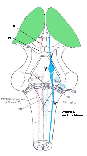 Nucleus ambiguus: Is the motor nucleus of the vagus nerve. It lies within the medulla and is approximately 2 cm long in reticular formation of medulla. Superior portion of the nucleus projects fibers to the 9th cranial nerve, while the middle portion to the 10th nerve, and the inferior portion to the cranial part of the 11th cranial nerve. The efferent fibers of the dorsal nucleus innervates the involuntary muscles of bronchi, esophagus, heart, stomach, small intestine, and part of the large intestine. The efferent fibers of the nucleus of the tract of solitarius carry sensory fibers from the pharynx, larynx, and esophagus.