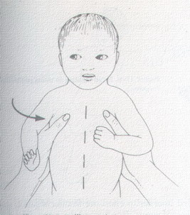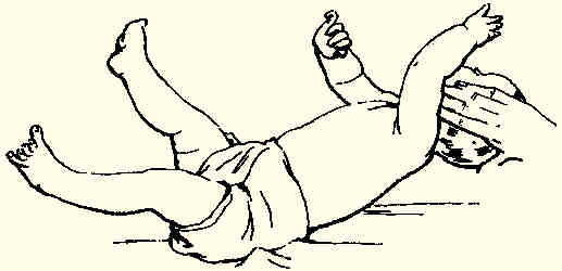 Vertical acceleration: In this test the baby is held in a supine position on the examiner's extended forearms. The head and trunk must be aligned and parallel to the ground. A rapid downward acceleration is produced to the baby's horizontal body by the examiner, who bends on his / her knees to a crouched position. A normal reflex response consists of abduction and extension of the arms with fanning of the hands. This response is similar to that of startle reflex (Moro's reflex). The only difference being the absence orf dorsiflexion of the head, which eliminates proprioceptive input from the cervical vertebrae. Since the stimulus is vertical acceleration, it most probably stimualtes the maculae of the utricle, as opposed to the cristae of the semicircular canals that are stimulated with the Moro reflex.