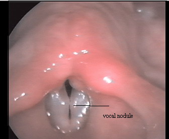 This disorder frequently affects children and adults. In children it appears as spindle shaped thickenings of the edges of the vocal cords, whereas in adults they appear as more localised thickenings, varying from small points - nodules. These nodules typically appear at the junction of the anterior and middle 1/3 of the vocal cords. They appear almost aways symmetrically.