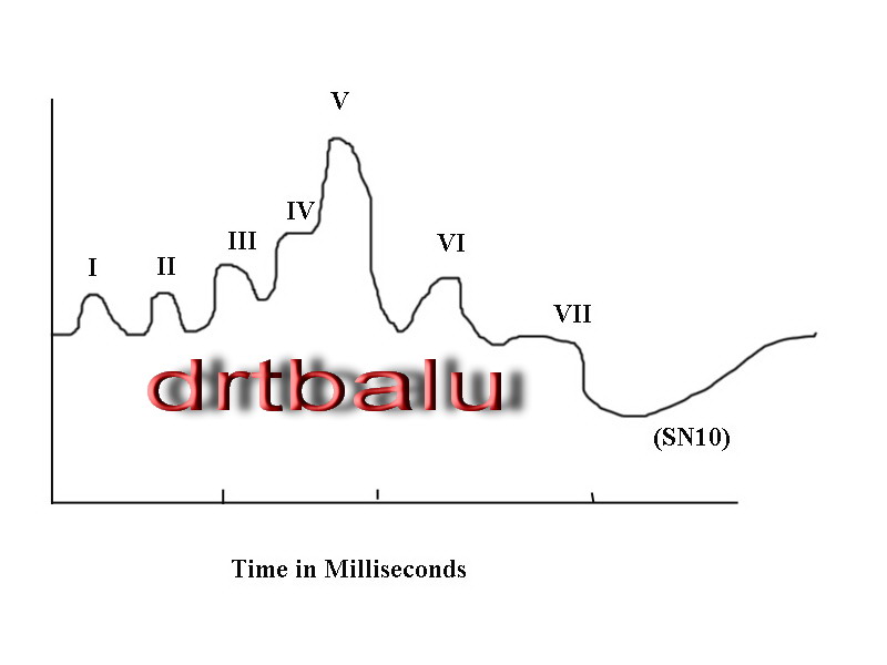 In auditory brain stem evoked response audiometry, the impulses are generated by the brain stem. These impulses when recorded contains a series of peaks and troughs. The positive peaks (vortex positive) are referred to by the Roman numerals I - VII.