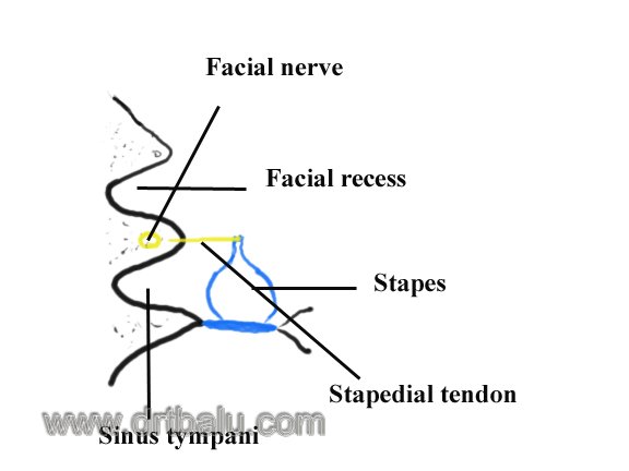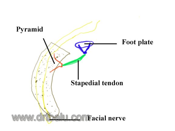 Pyramid is a small conical projection which is hollow and its apex pointing anteriorly. It contains the stapedius muscle, the tendon of which passes forwards to insert into the neck of the stapes. The canal within the promontory curves downwards and backwards to join the descending portion of the facial nerve canal. Between the promontory and the tympanic annulus is the facial recess. The facial recess is bounded medially by the facial nerve and laterally by the tympanic annulus. Running through the wall between the two with varying degress of obliquity is the chorda tympani nerve. This nerve always run medial to the tympanic membrane. Drilling over the facial recess area between the facial nerve and the annulus in the angle formed by the chorda tympani nerve can lead into the middle ear cavity. This surgical approach to the middle ear cavity through this area is known as the facial recess approach. This approcah is suitable for surgeries involving the round window niche like placement of electrodes during cochlear implant procedures. Hypotympanum can also be approached through this approach.