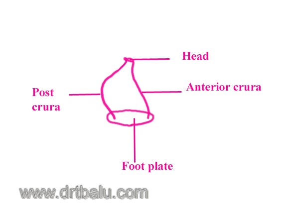 The stapes: The stapes consists of a head, neck, two crura and a base (footplate). The head of the stapes points laterally and has a small cartilage covered depression for articulation with the lenticular process of the incus. The tendon of the stapedius muscle attaches to the posterior part of the neck and the upper part of the posterior crura. The neck of the stapes gives rise to two crura, the anterior crura is thinner and less curved than the posterior crura. The two crura join the foot plate which closes the oval window during life. The average dimensions of the foot plate is 3mm x 1.4mm. The long axis of the foot plate is almost horizontal, with the posterior end being slightly lower than the anterior.