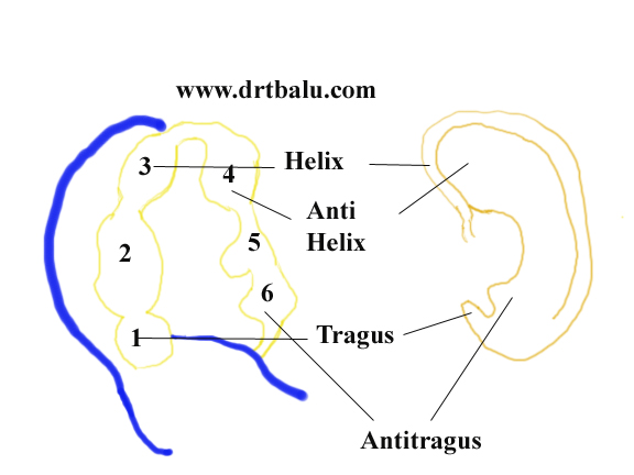 Embryology: During the sixty week of intrauterine life the external ear begins to develop around the dorsal end of the first branchial cleft. On either side of this cleft lie the first (mandibular) and second (hyoid) arches. The auricle develops from these arches as 6 small buds of mesenchyme known as the six hillocks of His. The first arch gives rise to the hillocks 1 to 3 and the second arch gives rise to hillocks 4 to 6.