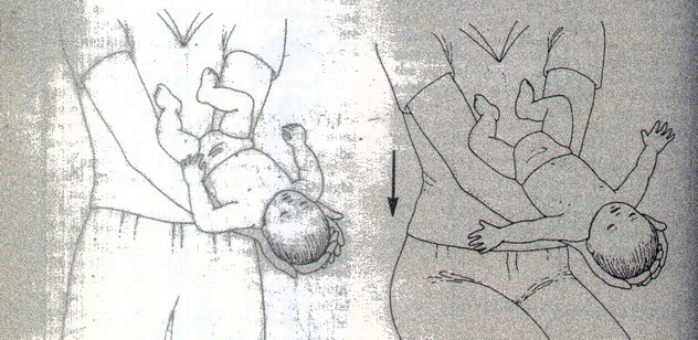 Vertical acceleration: In this test the baby is held in a supine position on the examiner's extended forearms. The head and trunk must be aligned and parallel to the ground. A rapid downward acceleration is produced to the baby's horizontal body by the examiner, who bends on his / her knees to a crouched position. A normal reflex response consists of abduction and extension of the arms with fanning of the hands. This response is similar to that of startle reflex (Moro's reflex). The only difference being the absence orf dorsiflexion of the head, which eliminates proprioceptive input from the cervical vertebrae. Since the stimulus is vertical acceleration, it most probably stimualtes the maculae of the utricle, as opposed to the cristae of the semicircular canals that are stimulated with the Moro reflex.